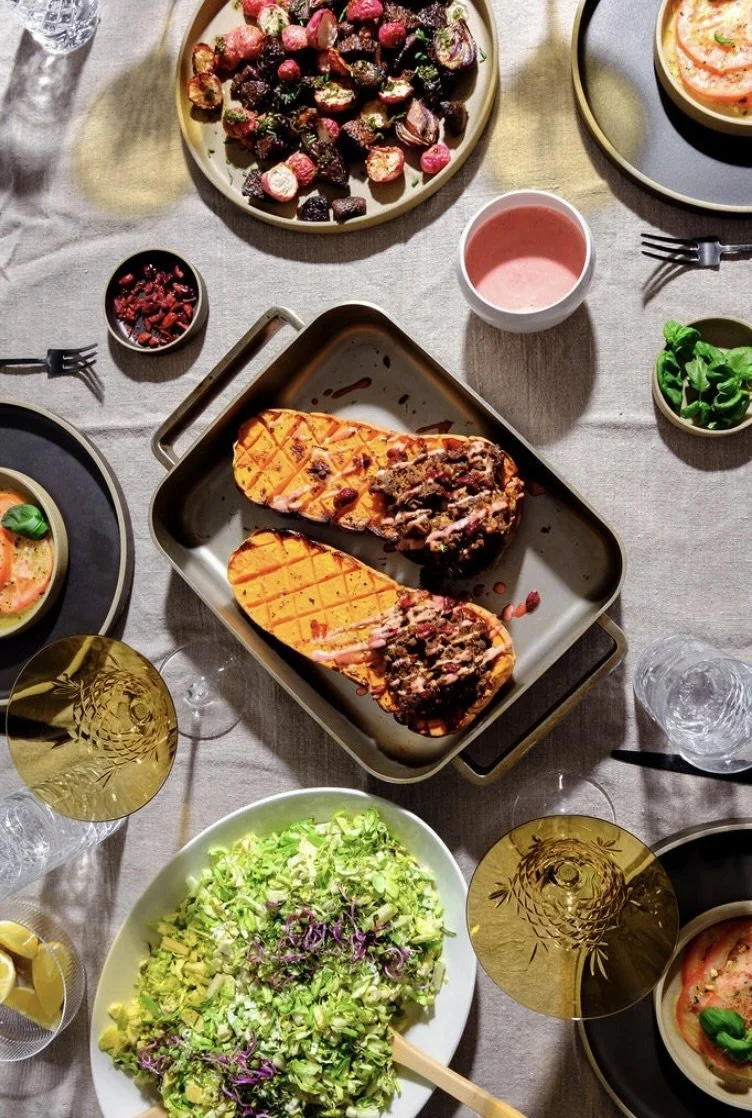 Ég elska að nota rósakál með hátíðamat en í þetta skiptið er það ferskt og þunnt skorið. Sykurbaunir og grænt epli gefa stökka og ferska áferð. Graslaukssósan er með kasjúhnetugrunni eins og svo oft áður, en kasjúhnetur eru hinn fullkomni, kremaði grunnur fyrir fjölbreyttar sósur. Brögðin stjórna svo í hvaða átt sósan fer en ég bætti við engifer, sítrónu og graslauk. Þetta salat mun klárast á methraða í boðinu og hentar jafn vel að degi og kvöldi til.