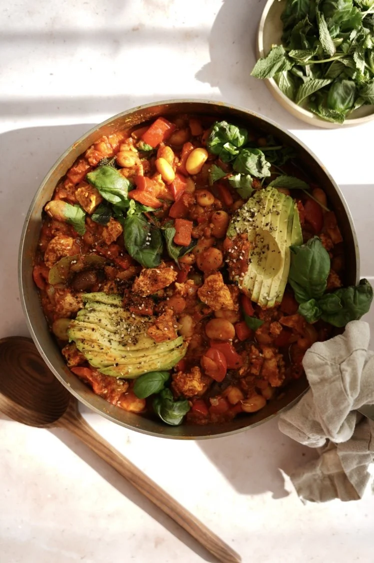 Shakhuka pönnuréttur er fullkominn í hádegismat eða brunch. Shakshuka er hefðbundin máltíð sem á rætur sínar að rekja til Norður-Afríku og er mjög vinsæl í Miðausturlöndum og víðar. Rétturinn er vanalega gerður með eggjum en þessi tofu útgáfa gefur eggjunum ekkert eftir að mínu mati. Smjörbaunirnar eru hlutlausar á bragðið en silkimjúkar og passa mjög vel með ásamt ólífunum. Ég ber réttinn alltaf fram með ofnbökuðu grænmeti og ég mæli mikið með því! Bakið einfaldlega kartöflur, blómkál, brokkolí og hvítkálsbáta á meðan hann mallar í pönnunni.