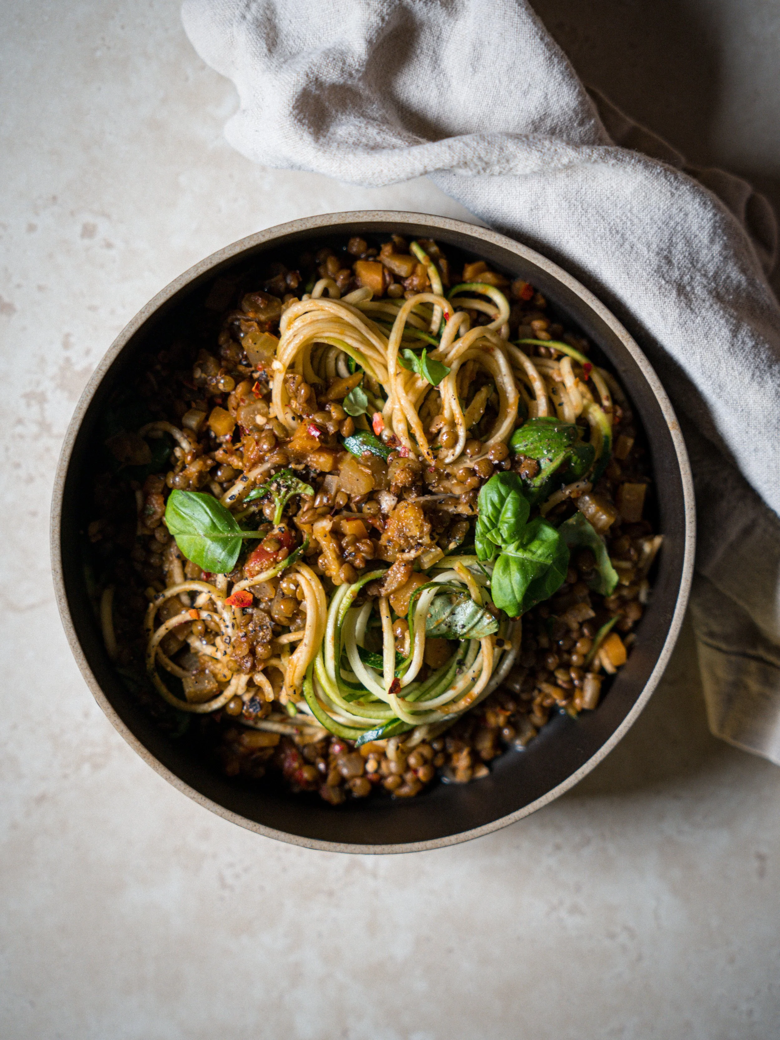 linsubauna bolognese með kúrbít & ferskri basiliku